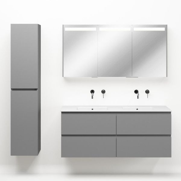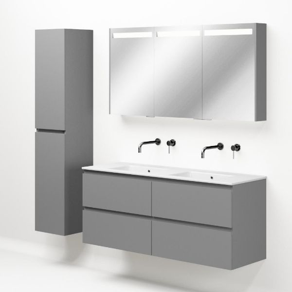Greeploos badkamermeubel in de kleur licht grijs mat is 140 cm breed. De wastafel is vervaardig in keramiek en heeft de kleur wit keramiek. Dit badkamermeubel met deze wastafel is leverbaar tussen de 60 cm t/m 120 cm