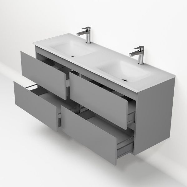 | Bellanti Gisella/Glass badmeubel 140x46 4 softclose laden licht grijs mat greeploos glazen wastafel dubbel wit met 2 kraangaten |