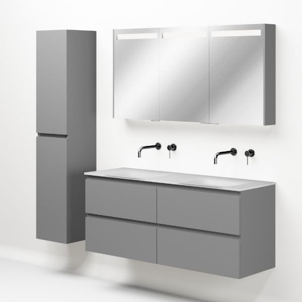 Greeploos badkamermeubel in de kleur licht grijs mat is 140 cm breed. De wastafel is vervaardig in glas en heeft de kleur wit. Dit badkamermeubel met deze wastafel is leverbaar tussen de 60 cm t/m 140 cm