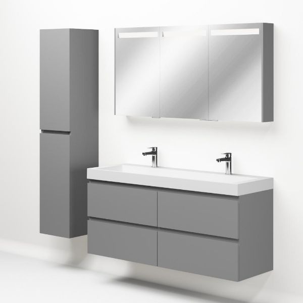 Greeploos badkamermeubel in de kleur licht grijs mat is 140 cm breed. De wastafel is vervaardig in polystone en heeft de kleur wit. Dit badkamermeubel met deze wastafel is leverbaar tussen de 60 cm t/m 140 cm