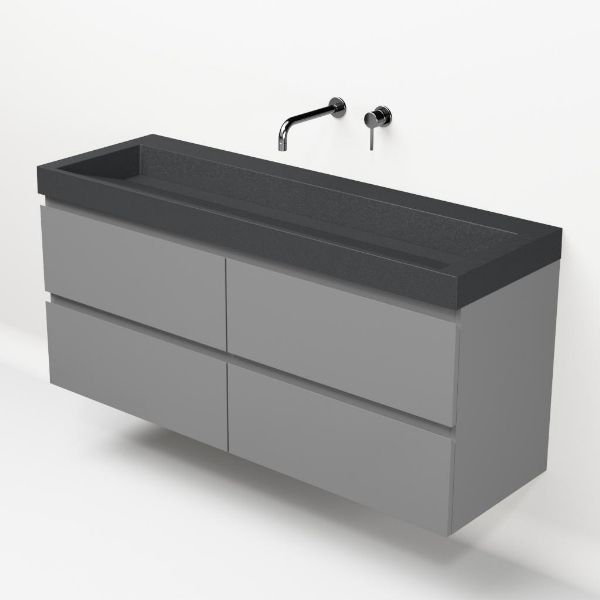 Greeploos badkamermeubel in de kleur licht grijs mat is 140 cm breed. De wastafel is vervaardig in quartz en heeft de kleur grijs mat quartz. Dit badkamermeubel met deze wastafel is leverbaar tussen de 60 cm t/m 140 cm