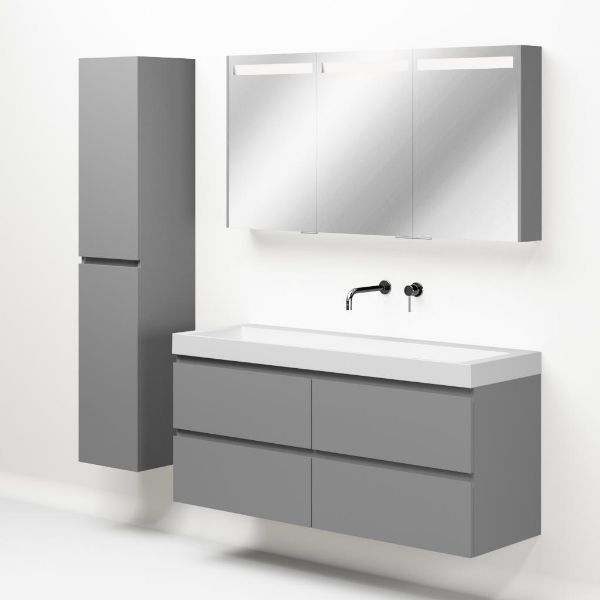 Greeploos badkamermeubel in de kleur licht grijs mat is 140 cm breed. De wastafel is vervaardig in quartz en heeft de kleur wit mat quartz. Dit badkamermeubel met deze wastafel is leverbaar tussen de 60 cm t/m 140 cm