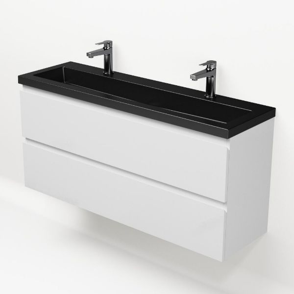 | Bellanti Secca/Esta ondiep badmeubel 120x36 2 softclose laden hoogglans wit greeploos polystone wastafel mat zwart met 2 kraangaten |