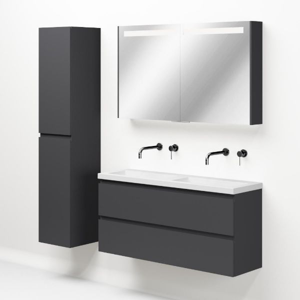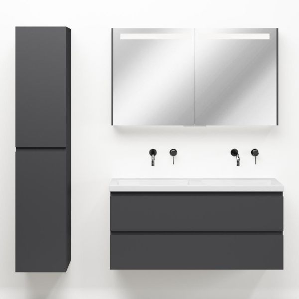 Ondiepe greeploos badkamermeubel in de kleur antraciet mat. Badmeubel is praktisch voor een compact badkamer. Het meubel van 120 cm breed is er. De wastafel is vervaardig in polystone en heeft de kleur wit. Dit badkamermeubel met deze wastafel is leverbaar tussen de 60 cm t/m 120 cm.