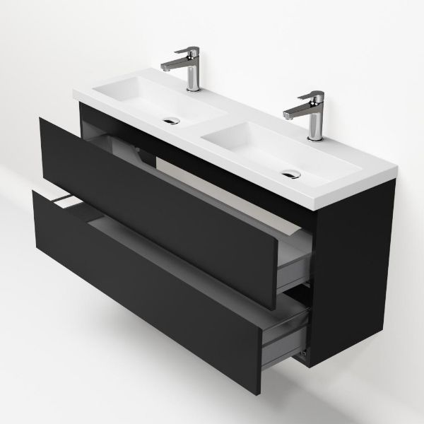 | | Bellanti Secca/Esta ondiep badmeubel 120x36 2 softclose laden mat zwart greeploos polystone wastafel dubbel wit met 2 kraangaten |