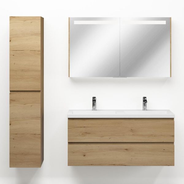 | | Bellanti Secca/Esta ondiep badmeubel 120x36 2 softclose laden natuur eiken greeploos polystone wastafel dubbel wit met 2 kraangaten |