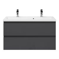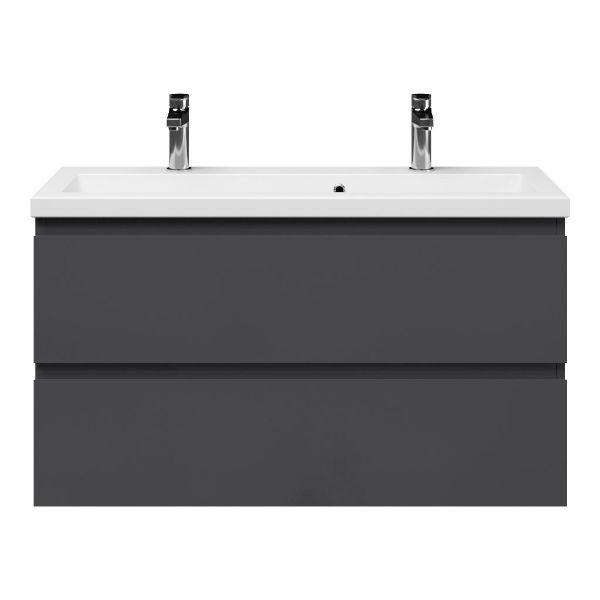 | | Bellanti Secca/Amelia ondiep badmeubel 100x36 2 softclose laden antraciet hoogglans greeploos keramische wastafel wit met 2 kraangaten |