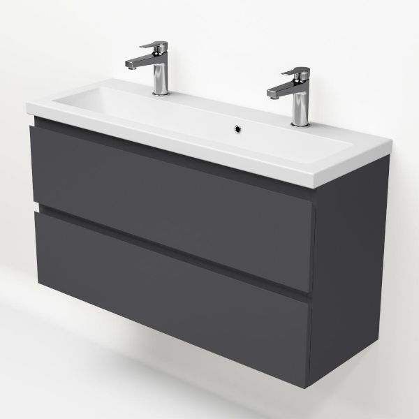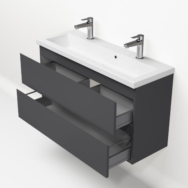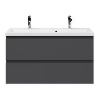 | | Bellanti Secca/Amelia ondiep badmeubel 100x36 2 softclose laden antraciet mat greeploos keramische wastafel wit met 2 kraangaten |