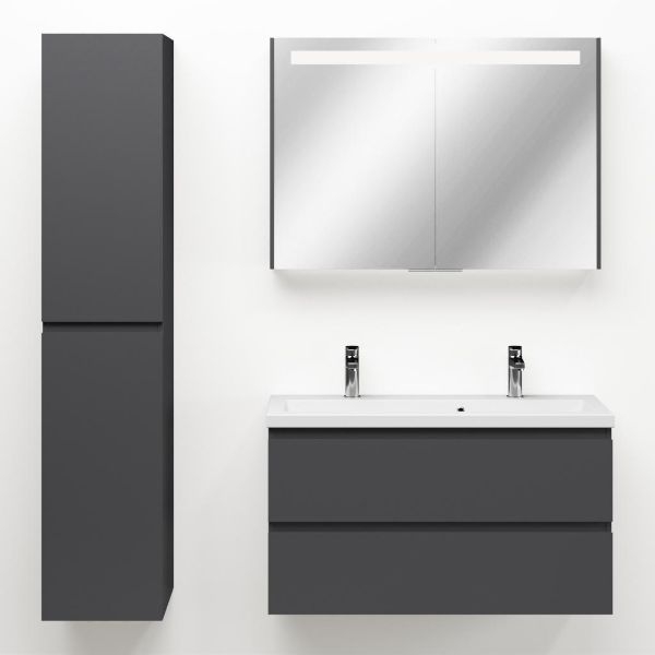 Ondiepe greeploos badkamermeubel in de kleur antraciet mat. Badmeubel is praktisch voor een compact badkamer. Het meubel van 100 cm breed is er. De wastafel is vervaardig in keramiek en heeft de kleur wit keramiek. Dit badkamermeubel met deze wastafel is leverbaar tussen de 60 cm t/m 120 cm.