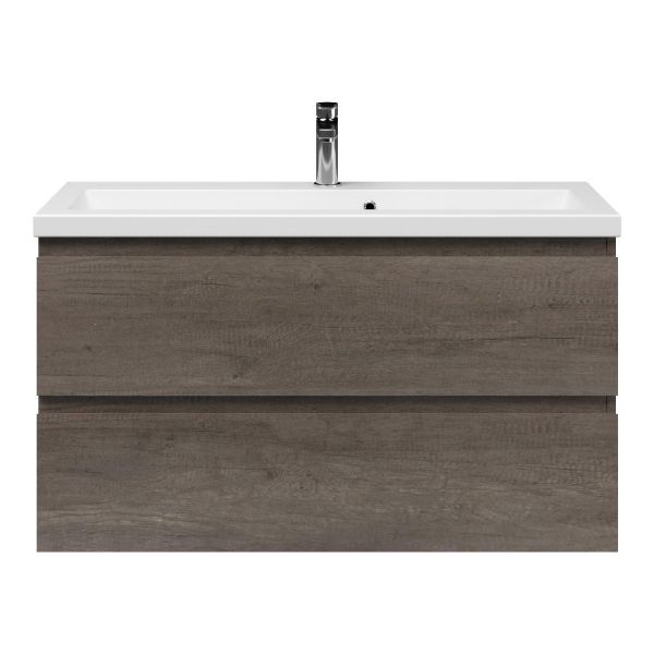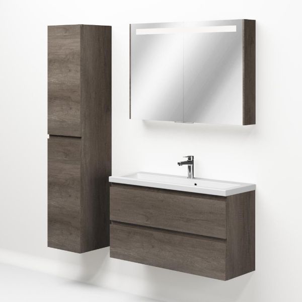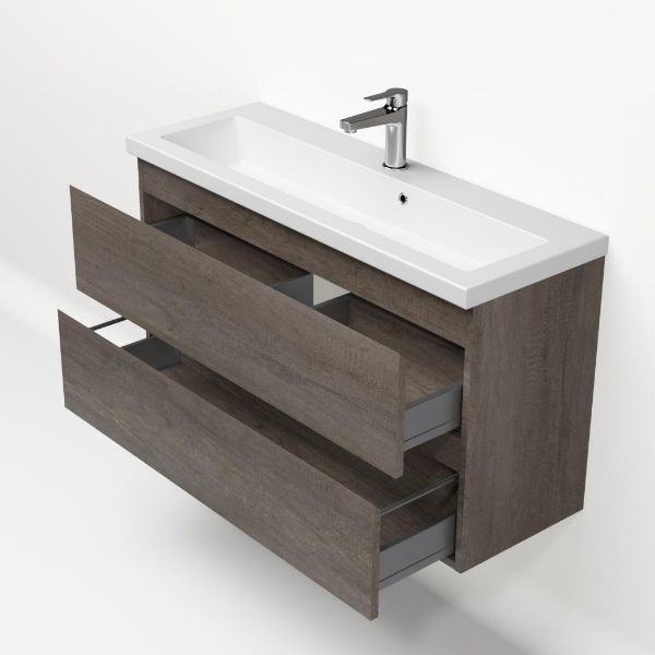 Ondiepe greeploos badkamermeubel in de kleur olm donker grijs. Badmeubel is praktisch voor een compact badkamer. Het meubel van 100 cm breed is er. De wastafel is vervaardig in keramiek en heeft de kleur wit mat keramiek. Dit badkamermeubel met deze wastafel is leverbaar tussen de 60 cm t/m 120 cm.