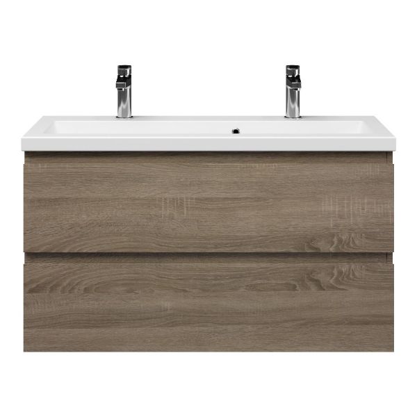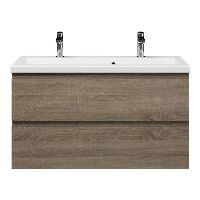 | Bellanti Secca/Amelia ondiep badmeubel 100x36 2 softclose laden donker eiken greeploos keramische wastafel mat wit met 2 kraangaten |