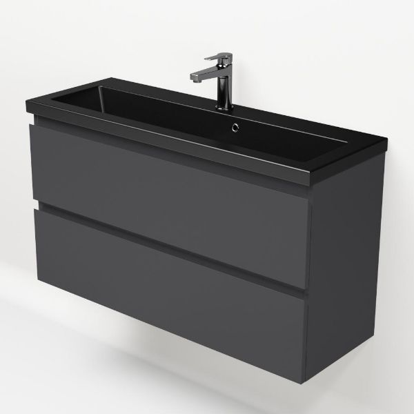 Ondiepe greeploos badkamermeubel in de kleur antraciet mat. Badmeubel is praktisch voor een compact badkamer. Het meubel van 100 cm breed is er. De wastafel is vervaardig in keramiek en heeft de kleur zwart mat keramiek. Dit badkamermeubel met deze wastafel is leverbaar tussen de 60 cm t/m 120 cm.