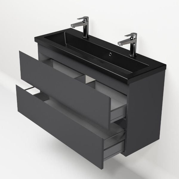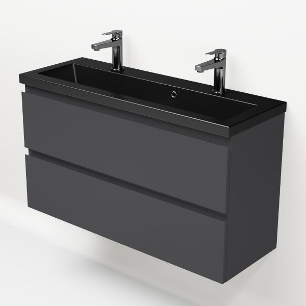 | Bellanti Secca/Amelia ondiep badmeubel 100x36 2 softclose laden antraciet mat greeploos keramische wastafel mat zwart met 2 kraangaten |