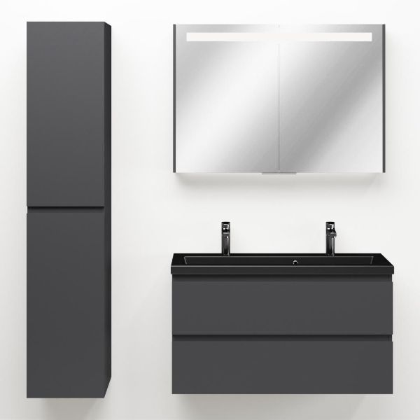 Ondiepe greeploos badkamermeubel in de kleur antraciet mat. Badmeubel is praktisch voor een compact badkamer. Het meubel van 100 cm breed is er. De wastafel is vervaardig in keramiek en heeft de kleur zwart mat keramiek. Dit badkamermeubel met deze wastafel is leverbaar tussen de 60 cm t/m 120 cm.