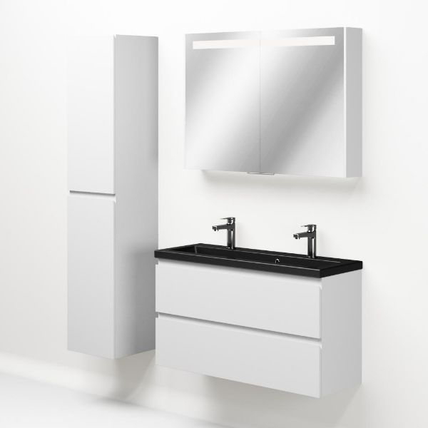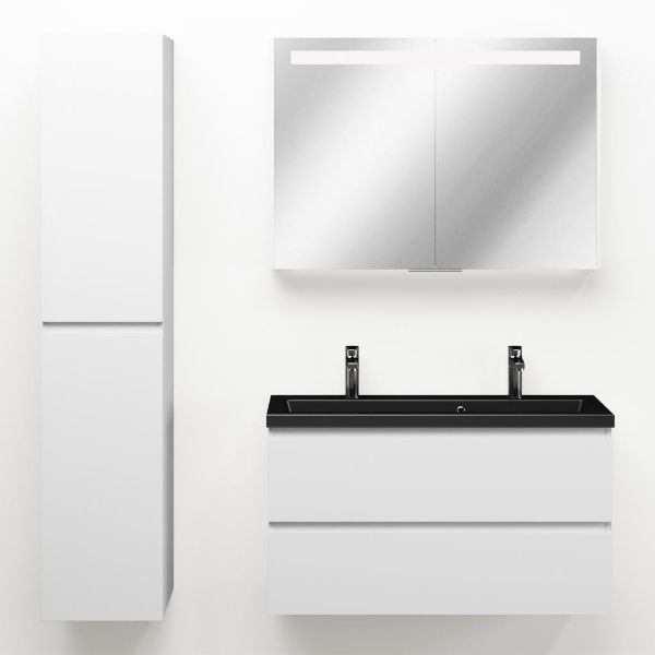 Ondiepe greeploos badkamermeubel in de kleur wit mat. Badmeubel is praktisch voor een compact badkamer. Het meubel van 100 cm breed is er. De wastafel is vervaardig in keramiek en heeft de kleur zwart mat keramiek. Dit badkamermeubel met deze wastafel is leverbaar tussen de 60 cm t/m 120 cm.