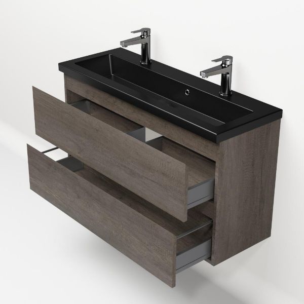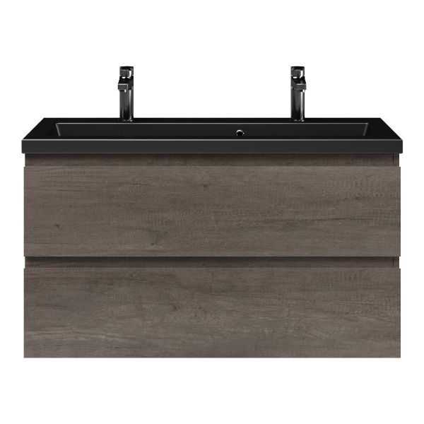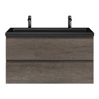 | Bellanti Secca/Amelia ondiep badmeubel 100x36 2 softclose laden olm donker grijs greeploos keramische wastafel mat zwart met 2 kraangaten |