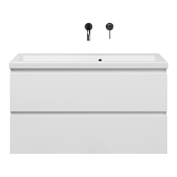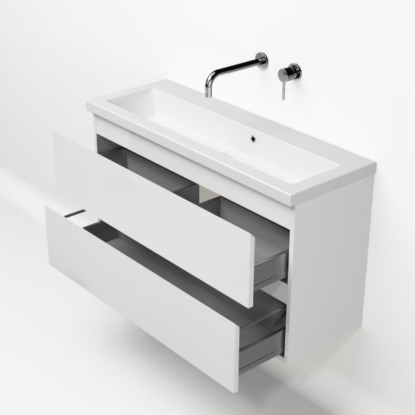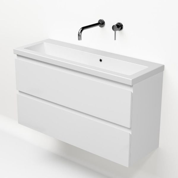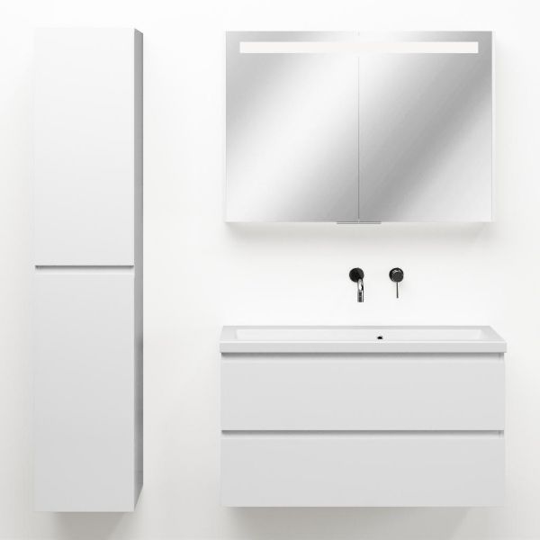 Ondiepe greeploos badkamermeubel in de kleur wit hoogglans. Badmeubel is praktisch voor een compact badkamer. Het meubel van 100 cm breed is er. De wastafel is vervaardig in keramiek en heeft de kleur wit mat keramiek. Dit badkamermeubel met deze wastafel is leverbaar tussen de 60 cm t/m 120 cm.