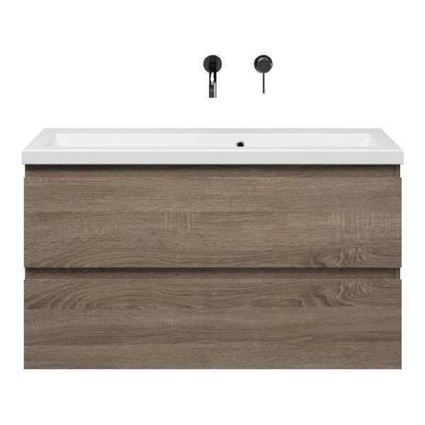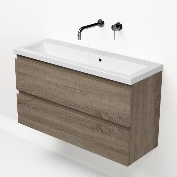 Ondiepe greeploos badkamermeubel in de kleur eiken donker. Badmeubel is praktisch voor een compact badkamer. Het meubel van 100 cm breed is er. De wastafel is vervaardig in keramiek en heeft de kleur wit mat keramiek. Dit badkamermeubel met deze wastafel is leverbaar tussen de 60 cm t/m 120 cm.