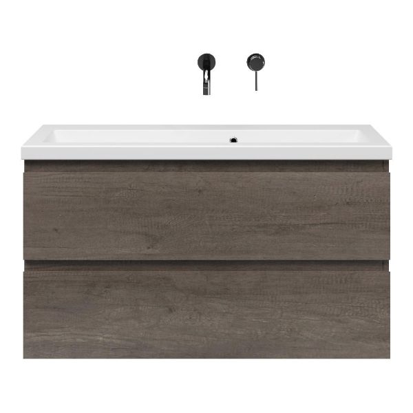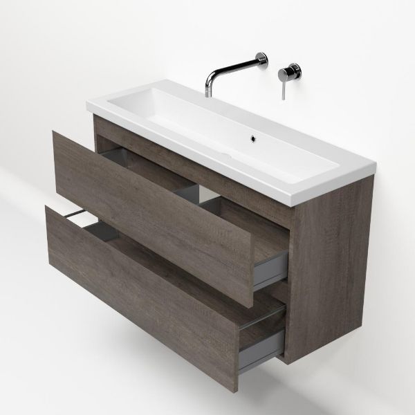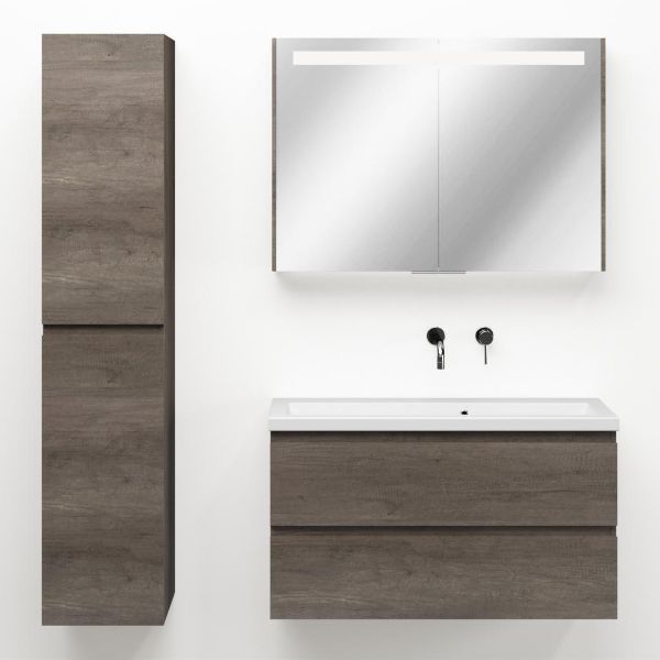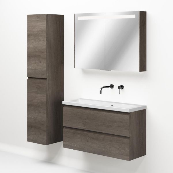 Ondiepe greeploos badkamermeubel in de kleur olm donker grijs. Badmeubel is praktisch voor een compact badkamer. Het meubel van 100 cm breed is er. De wastafel is vervaardig in keramiek en heeft de kleur wit mat keramiek. Dit badkamermeubel met deze wastafel is leverbaar tussen de 60 cm t/m 120 cm.