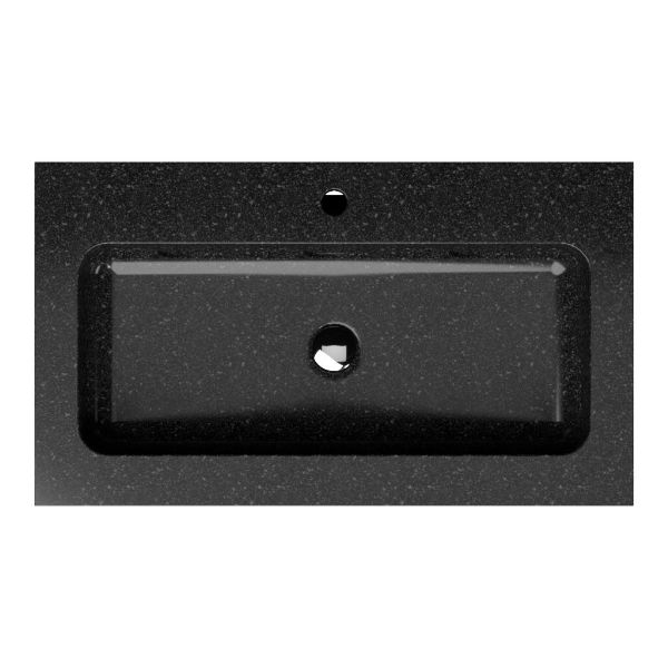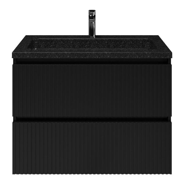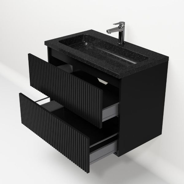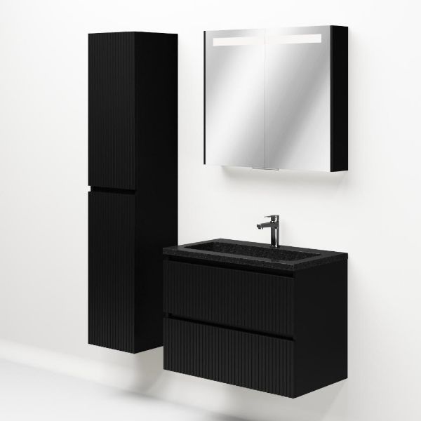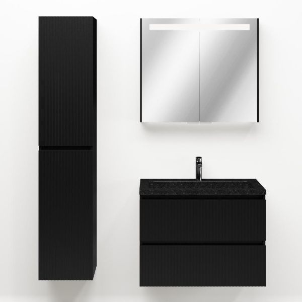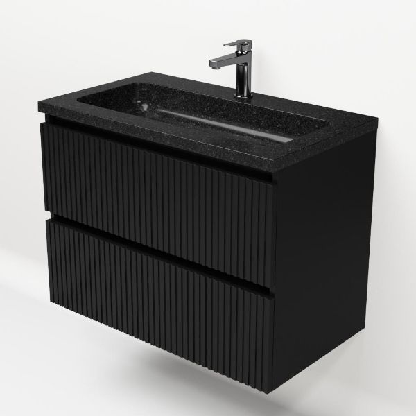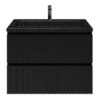 Greeploos badkamermeubel in de kleur zwart mat met met ribbel - latjes structuur is 80 cm breed. De wastafel is vervaardig in natuursteen en heeft de kleur shanxi black. Dit badkamermeubel met deze wastafel is leverbaar tussen de 60 cm t/m 120 cm