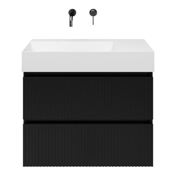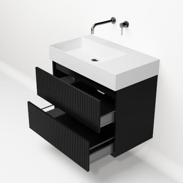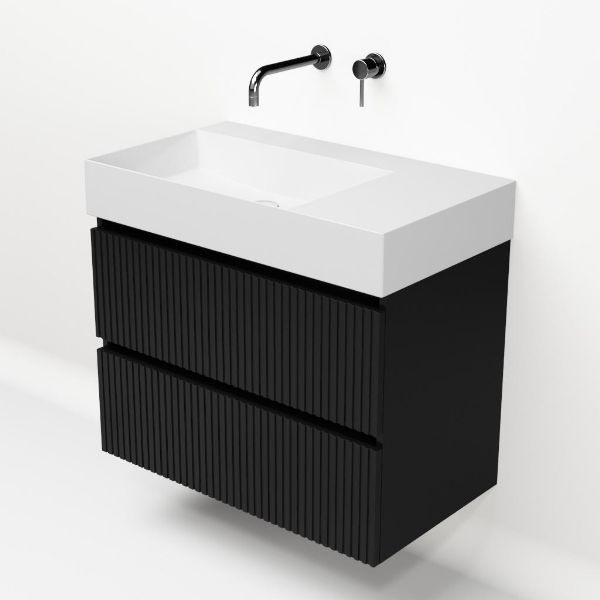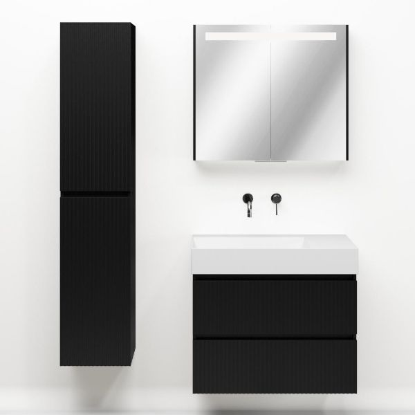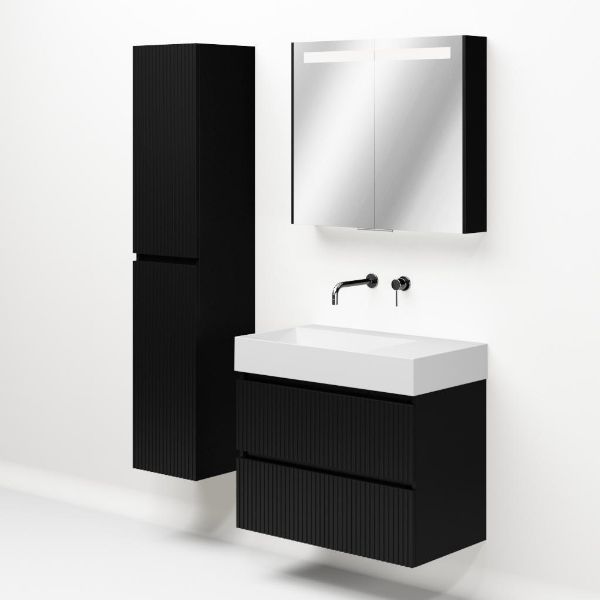 Greeploos badkamermeubel in de kleur zwart mat met met ribbel - latjes structuur is 80 cm breed. De wastafel is vervaardig in keramiek en heeft de kleur wit keramiek. Dit badkamermeubel met deze wastafel is leverbaar tussen de 60 cm t/m 160 cm