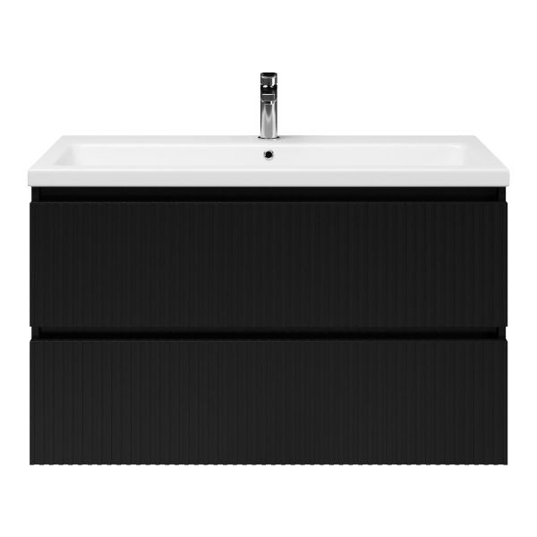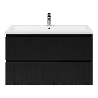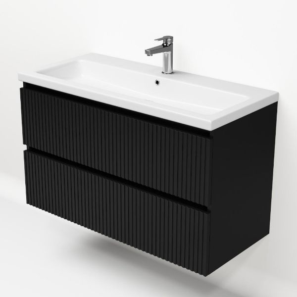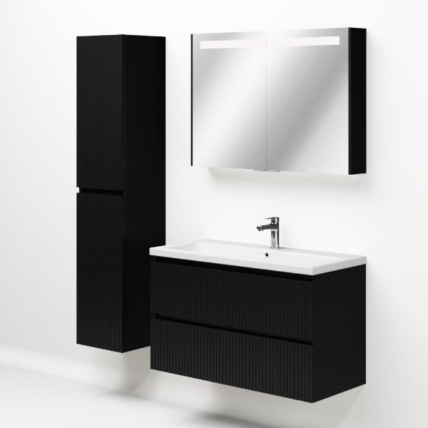 Greeploos badkamermeubel in de kleur zwart mat met met ribbel - latjes structuur is 100 cm breed. De wastafel is vervaardig in keramiek en heeft de kleur wit keramiek. Dit badkamermeubel met deze wastafel is leverbaar tussen de 60 cm t/m 140 cm