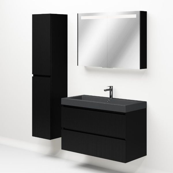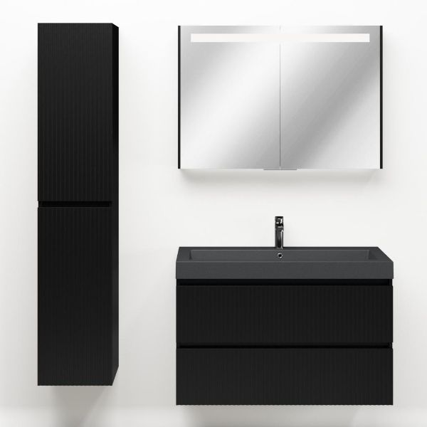 Bellanti Silvan/Esta-Q badmeubel 100x46 2 softclose laden met ribbel - latjes structuur mat zwart greeploos quartz wastafel mat grijs met 1 kraangat