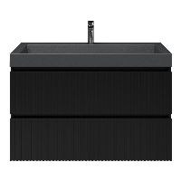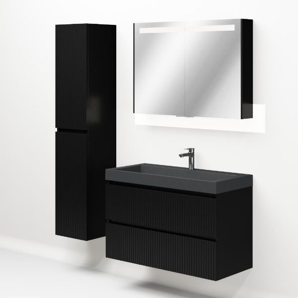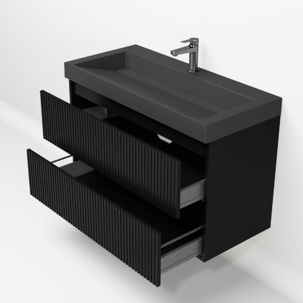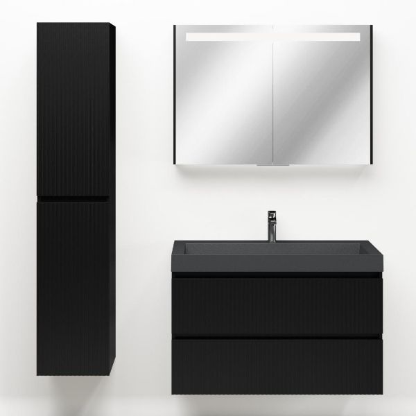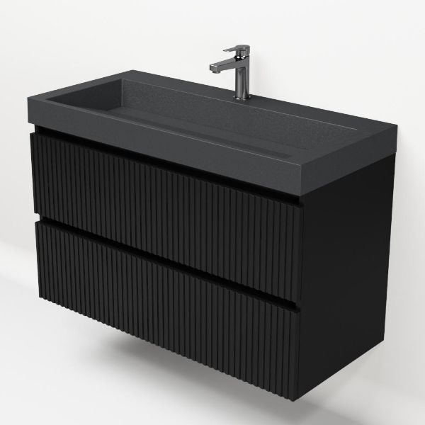 Greeploos badkamermeubel in de kleur zwart mat met met ribbel - latjes structuur is 100 cm breed. De wastafel is vervaardig in quartz en heeft de kleur grijs mat quartz. Dit badkamermeubel met deze wastafel is leverbaar tussen de 60 cm t/m 200 cm