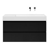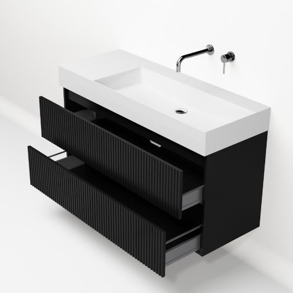 Greeploos badkamermeubel in de kleur zwart mat met met ribbel - latjes structuur is 120 cm breed. De wastafel is vervaardig in keramiek en heeft de kleur wit keramiek. Dit badkamermeubel met deze wastafel is leverbaar tussen de 60 cm t/m 160 cm