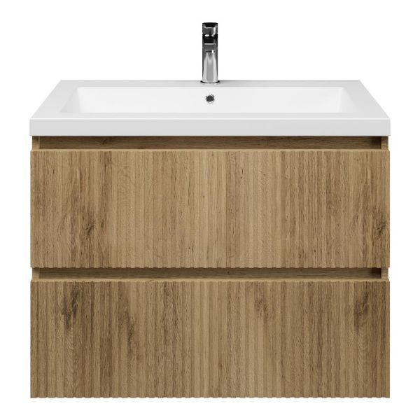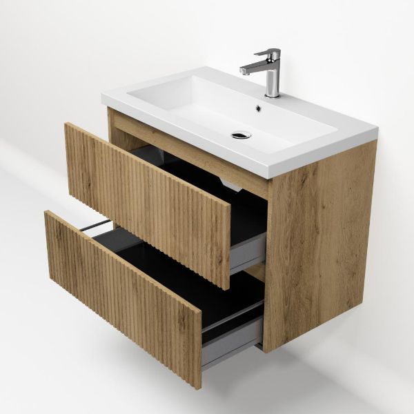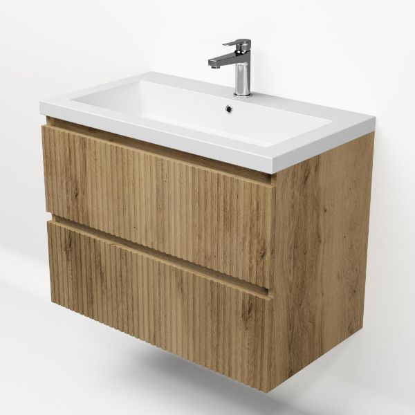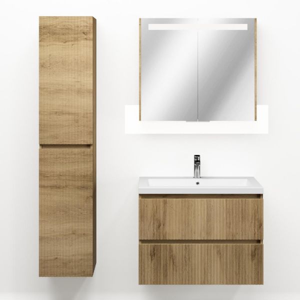 | Bellanti Silvan/Esta-Q badmeubel 80x46 2 softclose laden met ribbel - latjes structuur warm eiken greeploos quartz wastafel mat wit met 1 kraangat |