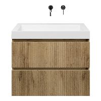 | | Bellanti Silvan/Renzo badmeubel 80x46 2 softclose laden met ribbel - latjes structuur warm eiken greeploos polystone wastafel wit zonder kraangaten |