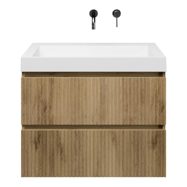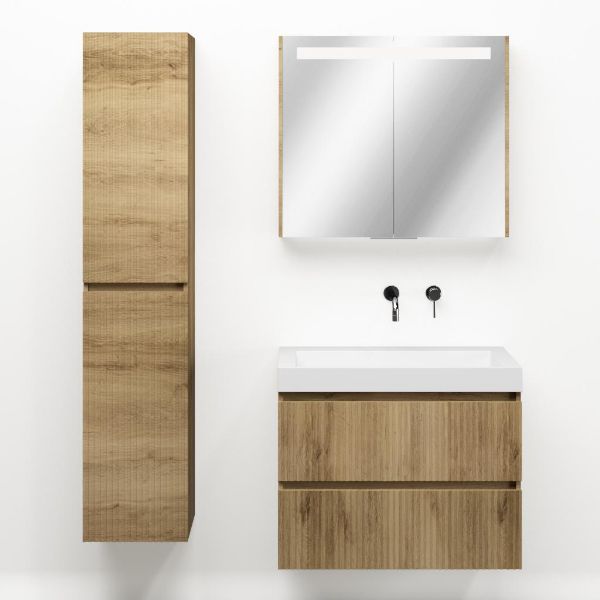 Greeploos badkamermeubel in de kleur eiken warm met met ribbel - latjes structuur is 80 cm breed. De wastafel is vervaardig in polystone en heeft de kleur wit. Dit badkamermeubel met deze wastafel is leverbaar tussen de 60 cm t/m 200 cm