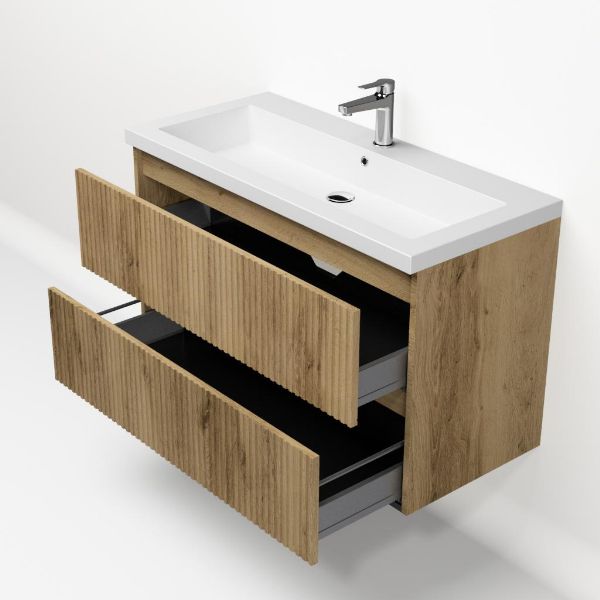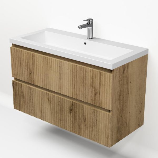 | | Bellanti Silvan/Esta-Q badmeubel 100x46 2 softclose laden met ribbel - latjes structuur warm eiken greeploos polystone wastafel mat wit met 1 kraangat |