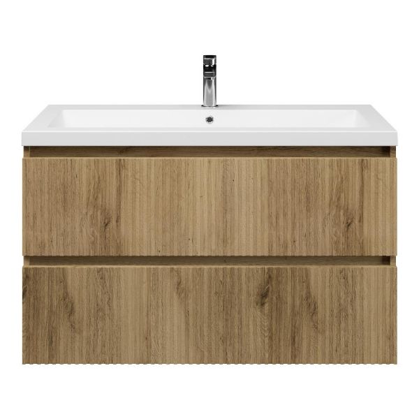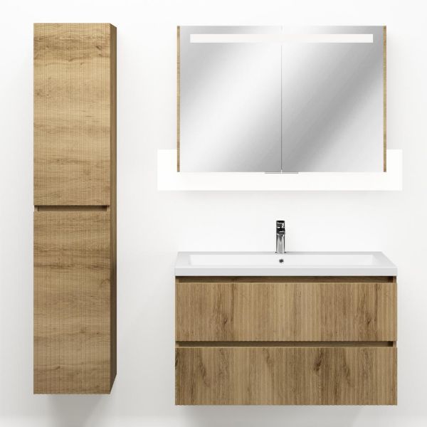 | Bellanti Silvan/Esta-Q badmeubel 100x46 2 softclose laden met ribbel - latjes structuur warm eiken greeploos polystone wastafel mat wit met 1 kraangat |