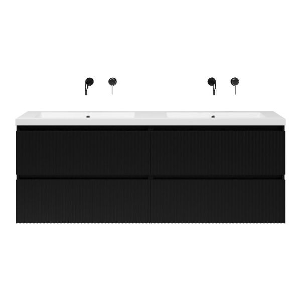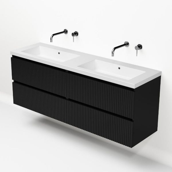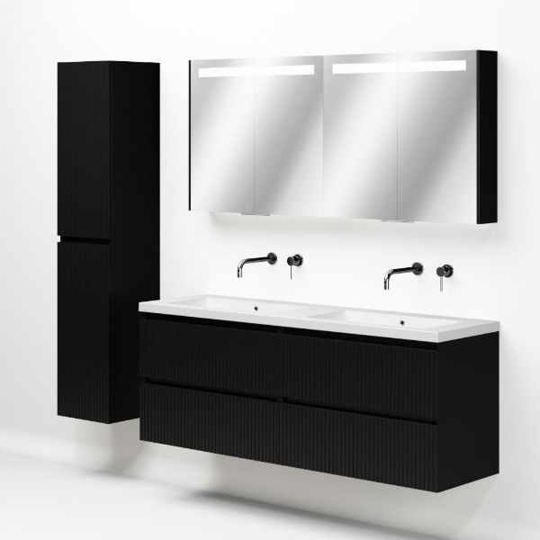 | Bellanti Silvan/Esta-Q badmeubel 160x46 4 softclose laden met ribbel - latjes structuur mat zwart greeploos quartz dubbele wastafel mat wit zonder kraangaten |