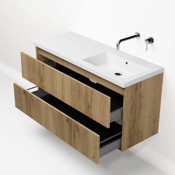 | Bellanti Silvan/Esta badmeubel 120x46 2 softclose laden met ribbel - latjes structuur warm eiken greeploos polystone wastafel wit zonder kraangaten |