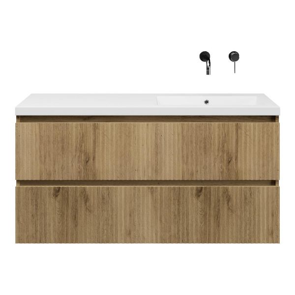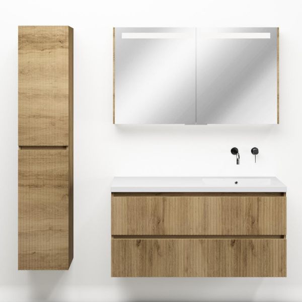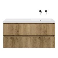 | | Bellanti Silvan/Esta badmeubel 120x46 2 softclose laden met ribbel - latjes structuur warm eiken greeploos polystone wastafel wit zonder kraangaten |