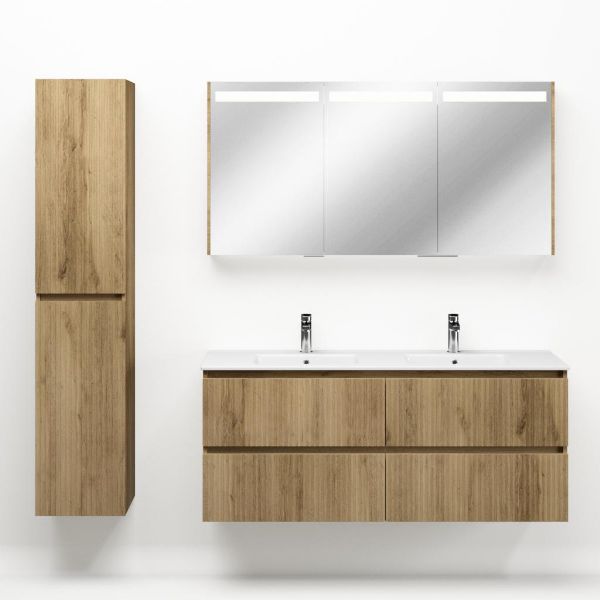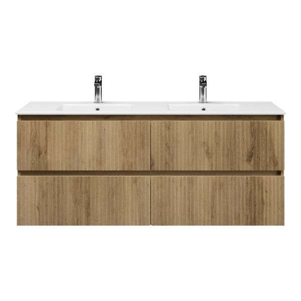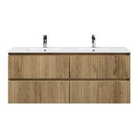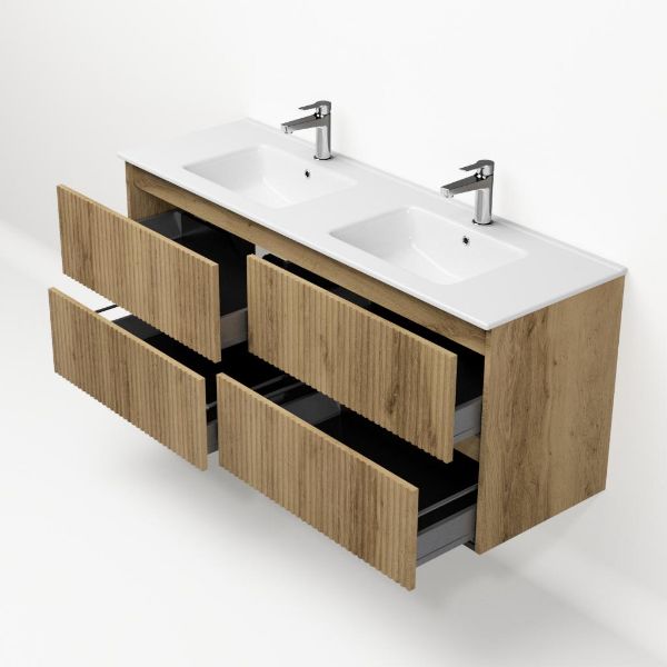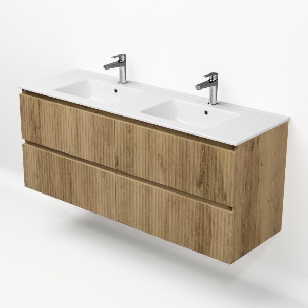 | Bellanti Silvan/Etna badmeubel 140x46 4 softclose laden met ribbel - latjes structuur warm eiken greeploos keramische wastafel dubbel wit met 2 kraangaten |