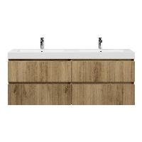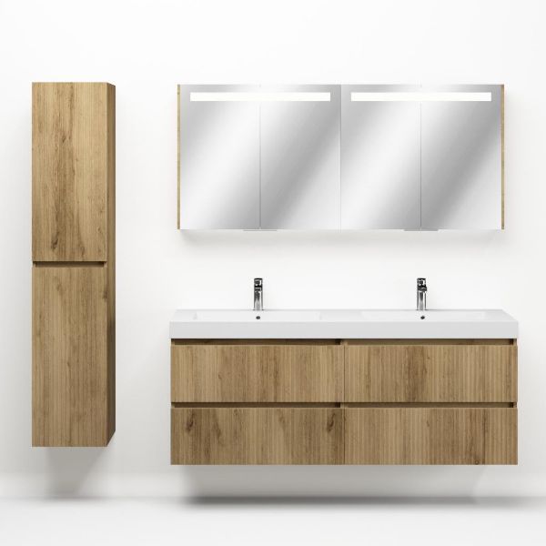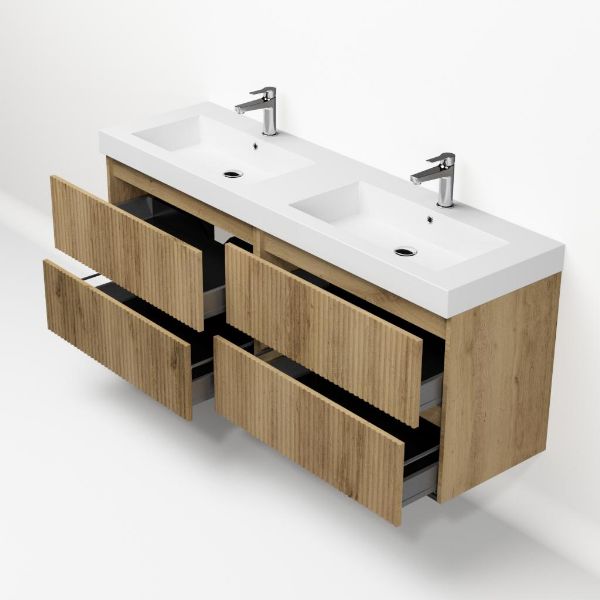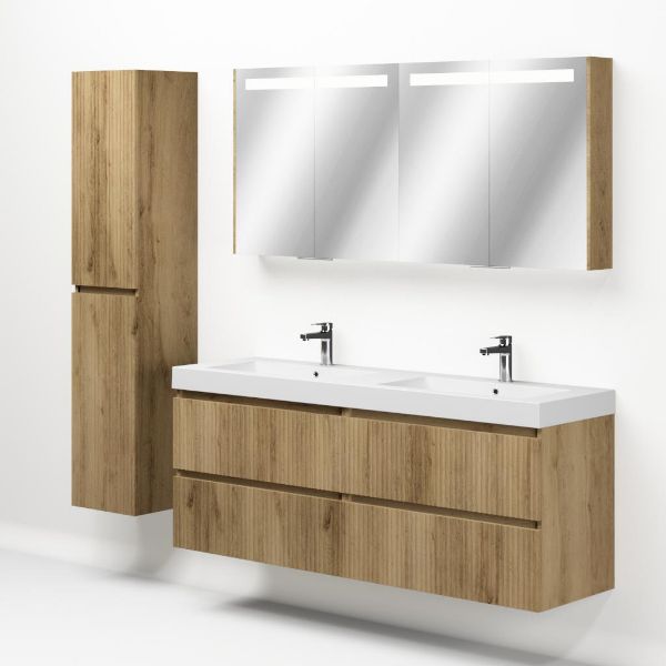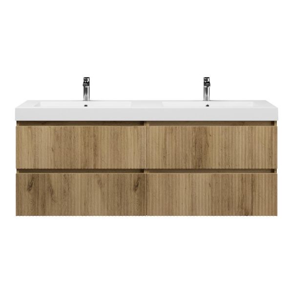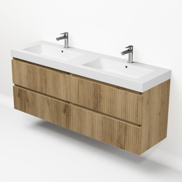 Bellanti Silvan/Esta badmeubel 160x46 4 softclose laden met ribbel - latjes structuur warm eiken greeploos polystone dubbele wastafel wit 2 kraangaten