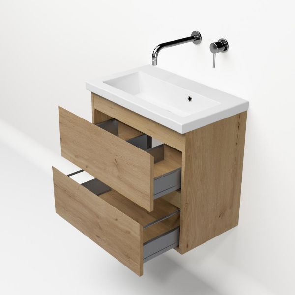 | Bellanti Secca/Amelia ondiep badmeubel 60x36 2 softclose laden eiken natuur greeploos keramisch wastafel wit zonder kraangaten |