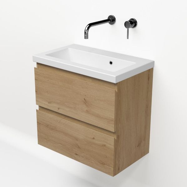 | | Bellanti Secca/Amelia ondiep badmeubel 60x36 2 softclose laden eiken natuur greeploos keramisch wastafel mat wit zonder kraangaten |