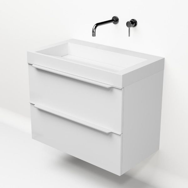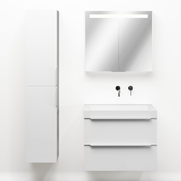Badkamermeubel met inleggreep naar keuze, in de kleur wit hoogglans in 80 cm breed. De wastafel is vervaardig in polystone en heeft de kleur wit. Dit badkamermeubel met deze wastafel is leverbaar tussen de 60 cm t/m 140 cm