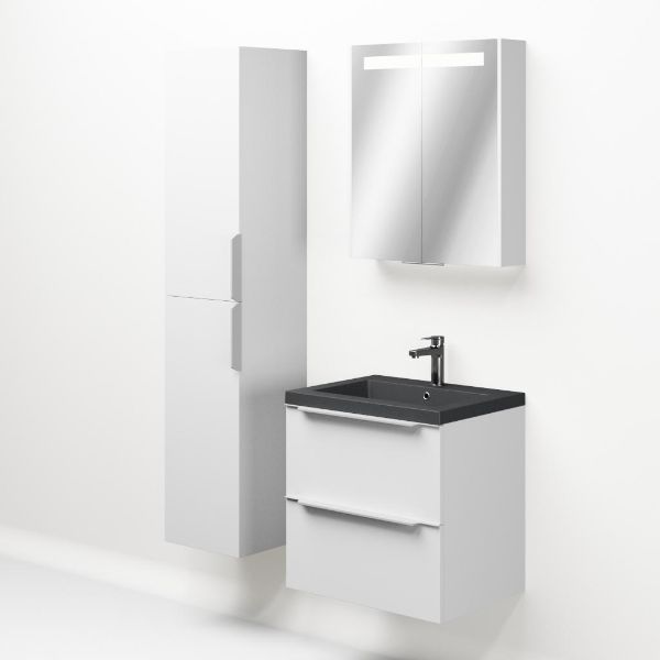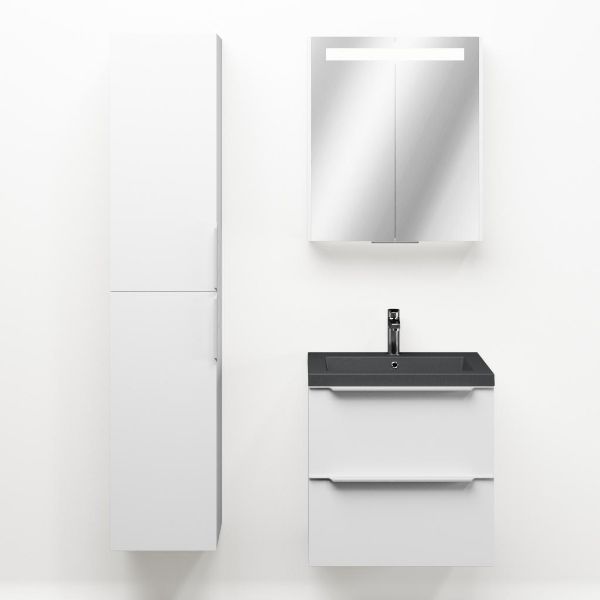 Badkamermeubel met inleggreep naar keuze, in de kleur wit mat in 60 cm breed. De wastafel is vervaardig in quartz en heeft de kleur grijs mat quartz. Dit badkamermeubel met deze wastafel is leverbaar tussen de 60 cm t/m 140 cm
