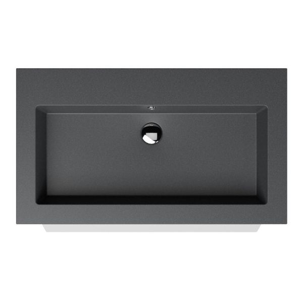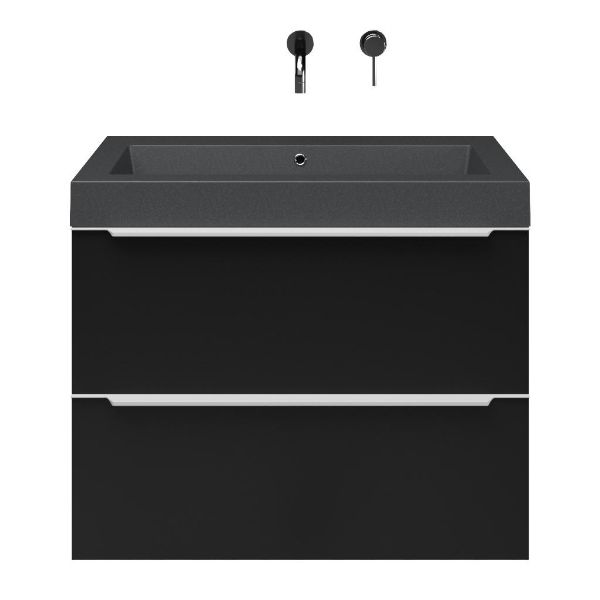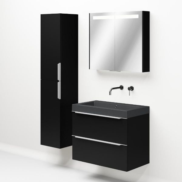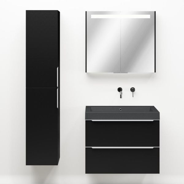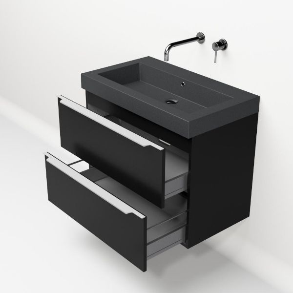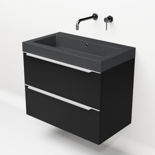 Badkamermeubel met inleggreep naar keuze, in de kleur zwart mat in 80 cm breed. De wastafel is vervaardig in quartz en heeft de kleur grijs mat quartz. Dit badkamermeubel met deze wastafel is leverbaar tussen de 60 cm t/m 140 cm