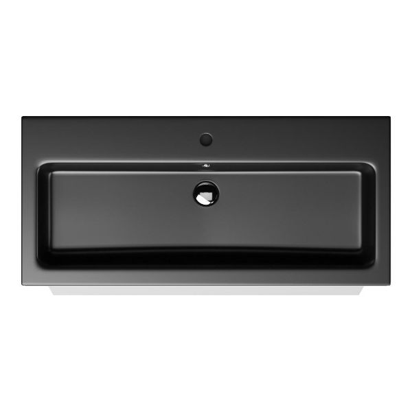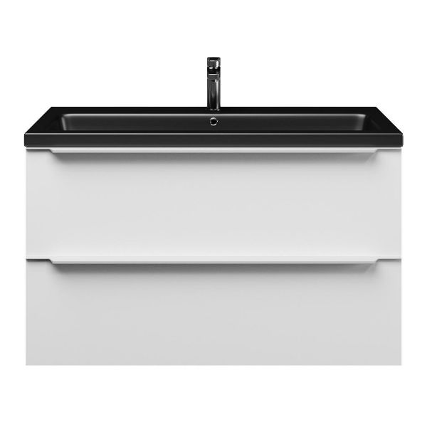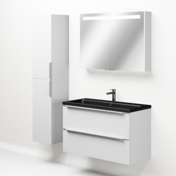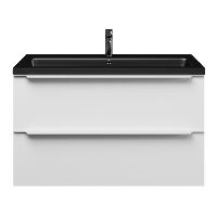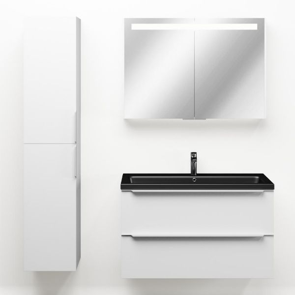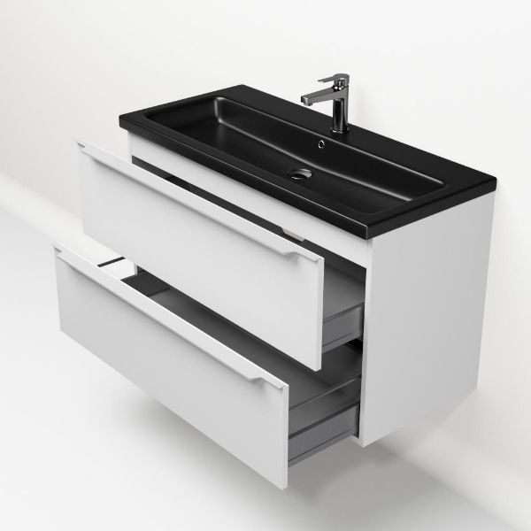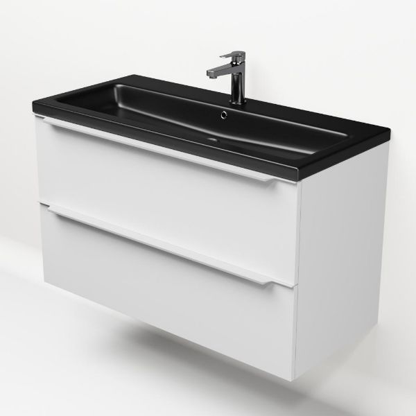 Badkamermeubel met inleggreep naar keuze, in de kleur wit mat in 100 cm breed. De wastafel is vervaardig in keramiek en heeft de kleur zwart mat keramiek. Dit badkamermeubel met deze wastafel is leverbaar tussen de 60 cm t/m 140 cm