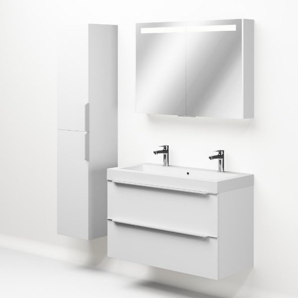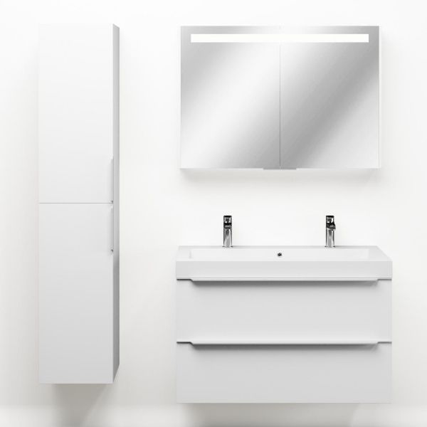 Badkamermeubel met inleggreep naar keuze, in de kleur wit mat in 100 cm breed.  De wastafel is vervaardig in polystone en heeft de kleur wit. Dit badkamermeubel met deze wastafel is leverbaar tussen de 60 cm t/m 200 cm