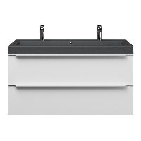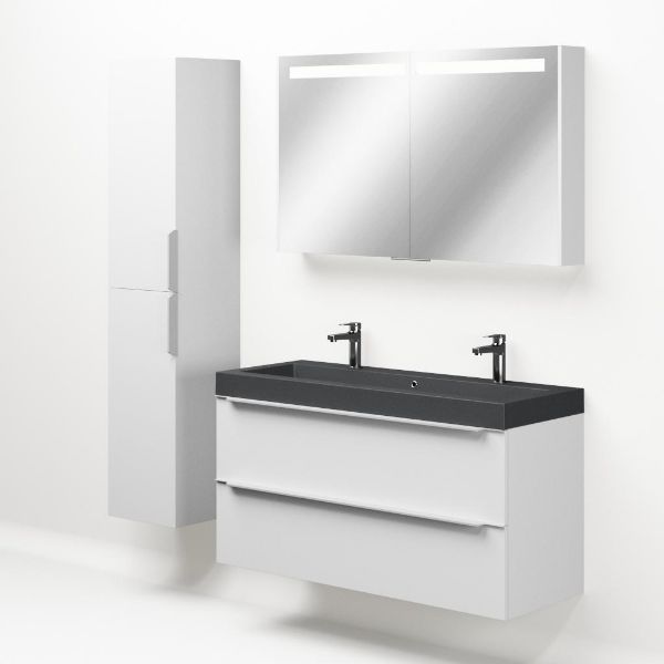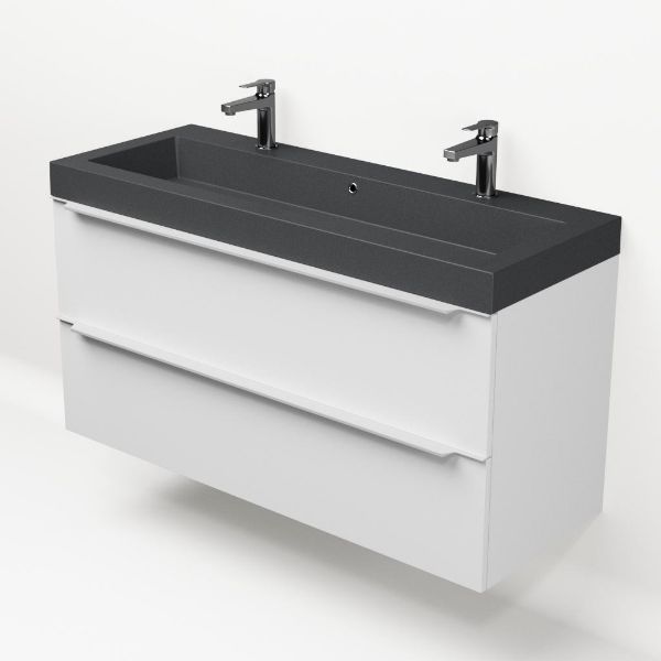 Badkamermeubel met inleggreep naar keuze, in de kleur wit mat in 120 cm breed.  De wastafel is vervaardig in quartz en heeft de kleur grijs mat quartz. Dit badkamermeubel met deze wastafel is leverbaar tussen de 60 cm t/m 140 cm