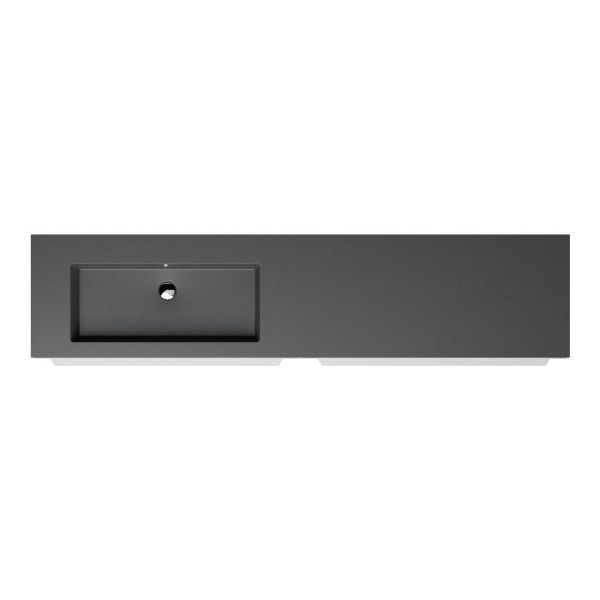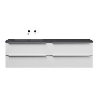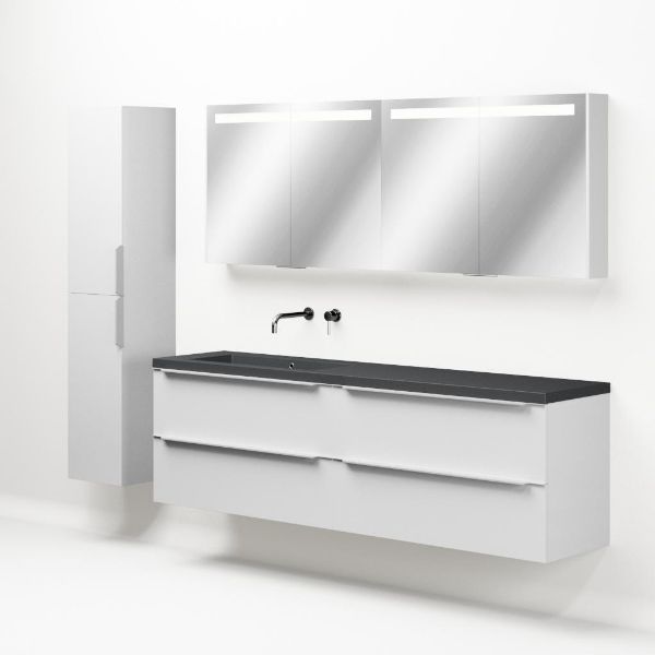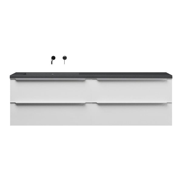 Badkamermeubel met inleggreep naar keuze, in de kleur wit hoogglans in 200 cm breed. De wastafel is vervaardig in quartz en heeft de kleur grijs mat quartz. Dit badkamermeubel met deze wastafel is leverbaar tussen de 60 cm t/m 140 cm