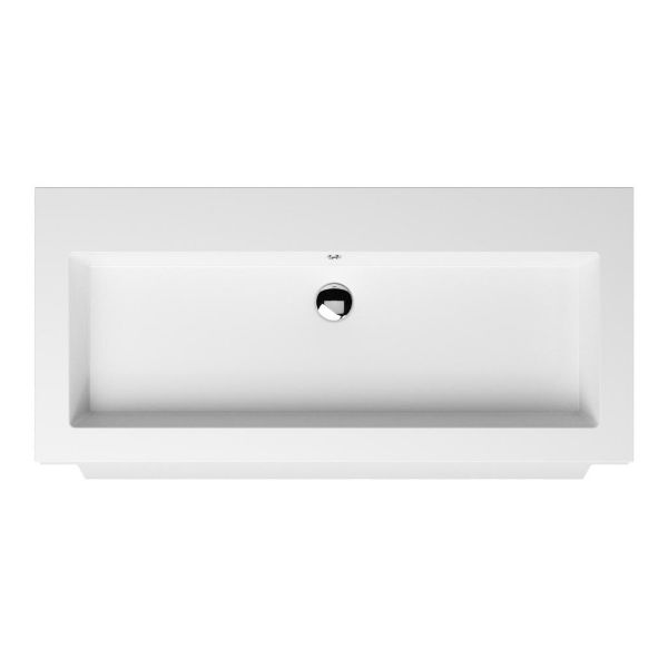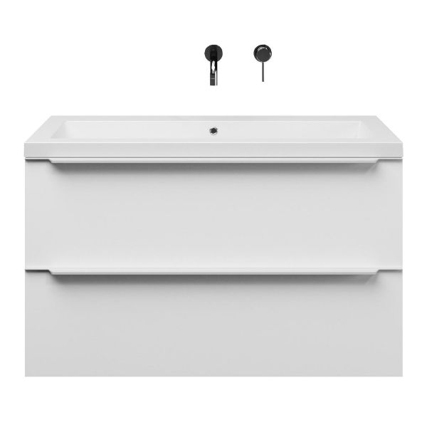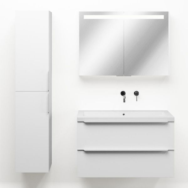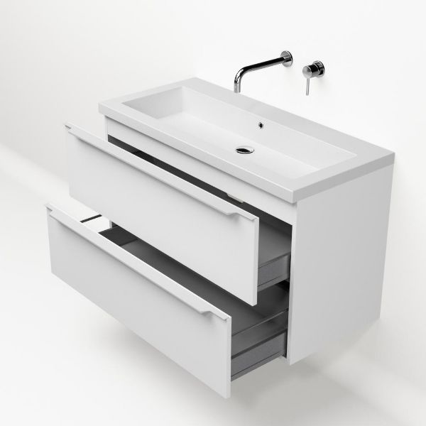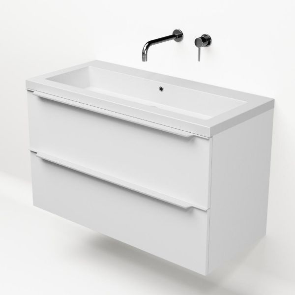 Badkamermeubel met inleggreep naar keuze, in de kleur wit mat in 100 cm breed.  De wastafel is vervaardig in quartz en heeft de kleur wit mat quartz. Dit badkamermeubel met deze wastafel is leverbaar tussen de 60 cm t/m 140 cm