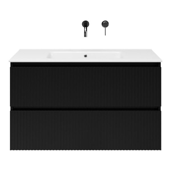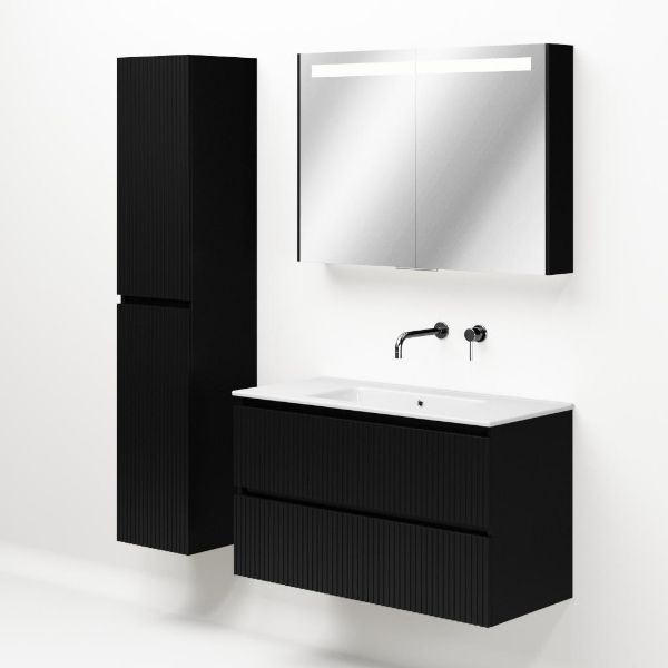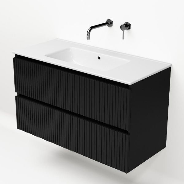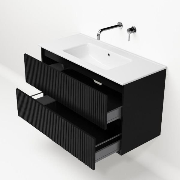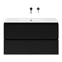 | Bellanti Silvan/Etna badmeubel 100x46 2 softclose laden met ribbel - latjes structuur mat zwart greeploos keramische wastafel wit zonder kraangat |